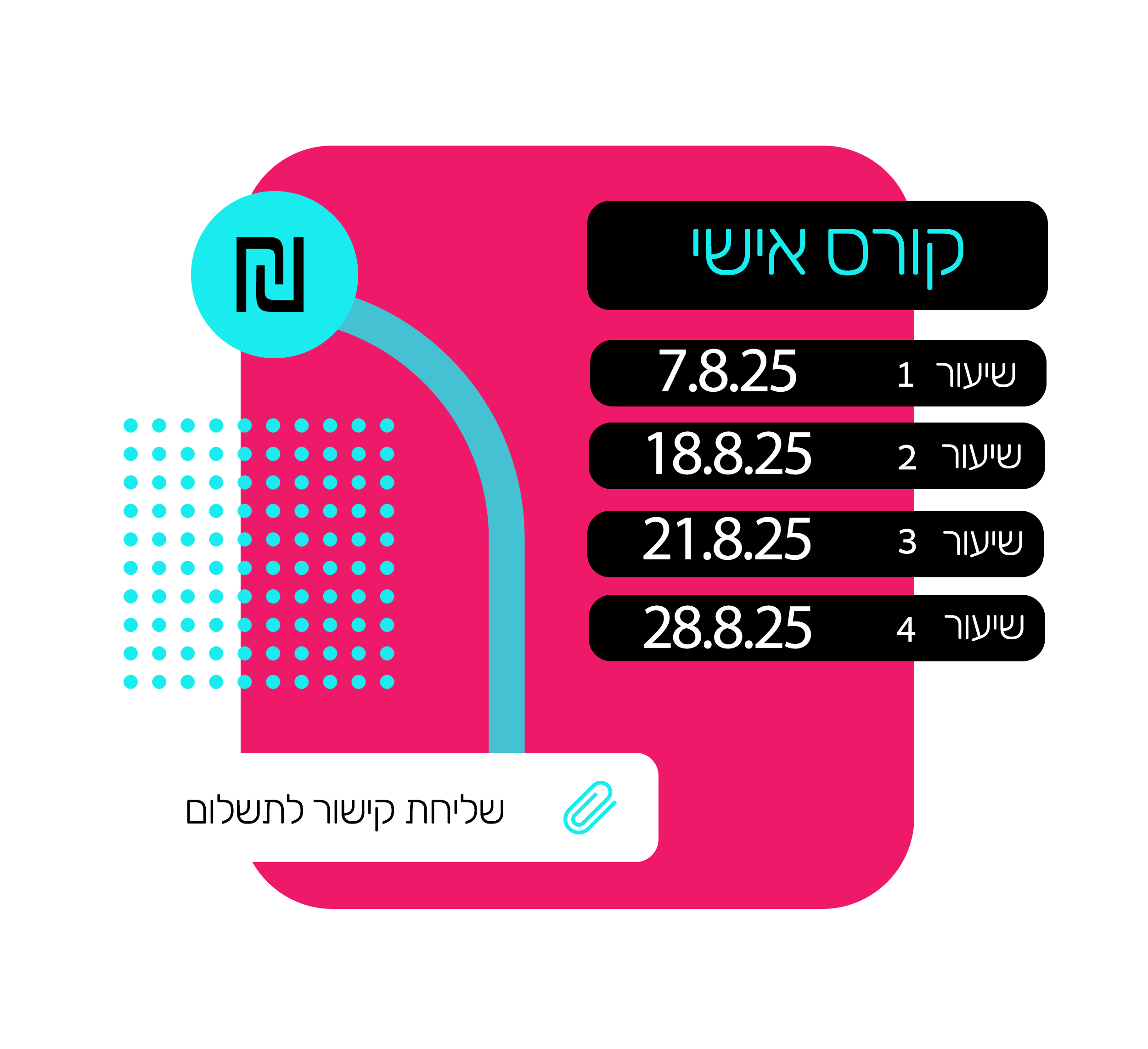 שילוב היומן של האפליקציה עם דפי התשלום שלנו מאפשרים לכם לייצר קישור חכם ובו פרטי הרשמה לקורסים וסדנאות, ניתן לספק מידע בקישור אודות הקורס, לקבוע מחיר ואפשרויות תשלום, לקבוע שיבוץ לאירועים ביומן כך שהאפליקציה תשלח תזכורות לנרשמים בהתאם ובצורה אוטומטית. בנוסף לקבוע שיש לחתום על טפסים ותכנון תהליך ההרשמה. פתרון דיגיטלי מושלם לקורסים וסדנאות.