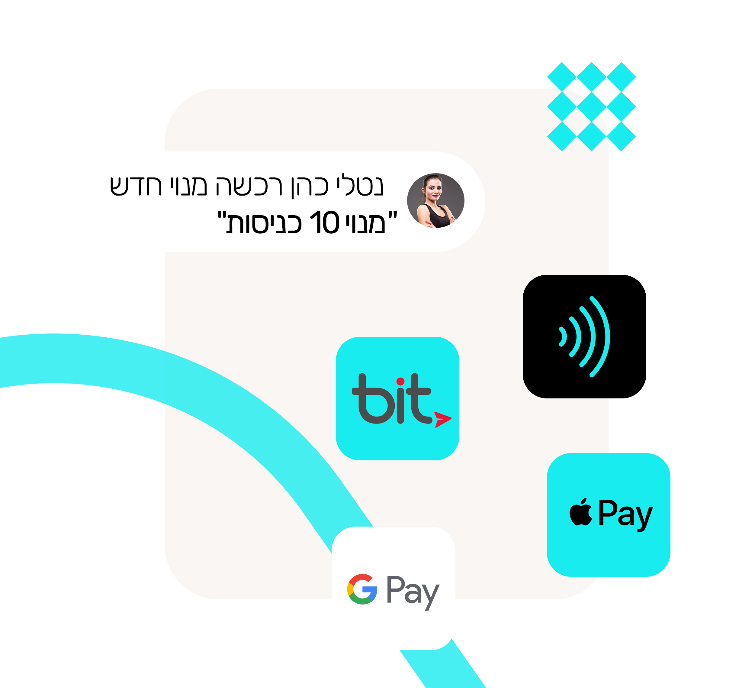 חברו את העסק שלכם לסליקת אשראי מהיום למחר וקדמו את העסק שלכם לאמצעי התשלום שהם קצה הטכנולוגיה, כך הנראות שלכם מול הלקוח תראה ברמה אחת מעל כולם! אפשר לקבל תשלומים דרך ביט ללא מגבלה שנתית, חברו את ממשק החיוב שלנו לתשלום בטאצ׳ וכך פתחו אפשרות קבלת תשלום ב- apple pay ו- google pay.